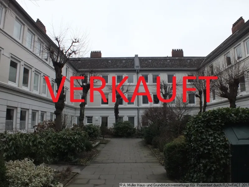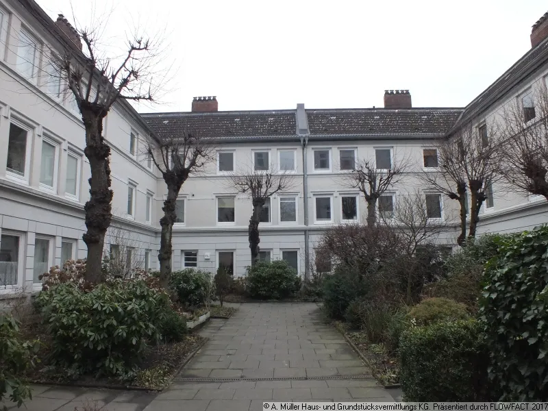 Je rechts und links in Strassenfront befinden sich zwei große Hausteile, in der Mitte führt der Weg in einen hübschen, begrünten Innenhof, in dem sich an allen drei Seiten kleinere Wohnhäuser anschliessen. Die angebotene Wohnung befindet sich hier hinten links im 2. Stockwerk/ Endetage.