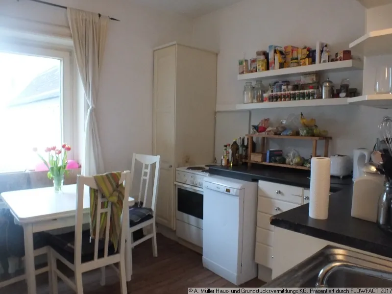 Nach Betreten der Wohnung befindet man sich im Hausflur (ca. 4,13 m2 gemäß Grundriss). Zur Rechten schliesst sich die Küche (ca. 9,66 m2) an, die mit weißen Einbaumöbeln ausgestattet ist und Platz für einen Esstisch vor dem Fenster bietet.