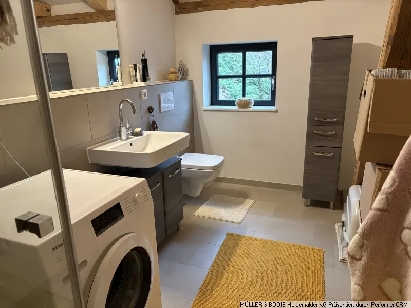Gleich links befindet sich das Duschbad mit Fenster gen Süden und Platz für Waschmaschine/Trockner.