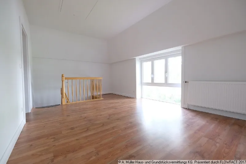 Über eine Holztreppe ist das Obergeschoss der Wohnung zu erreichen. Hier befinden sich ein angeschlossenes Schlafzimmer sowie das großzügige Wohnzimmer. Auch dieses Zimmer ist mit einem großen, bodentiefen Fenster verstehen und somit sehr hell und gemütlich.
