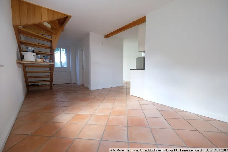 Angrenzend an die Küche befindet sich ein gemütlicher Essbereich, der genügend Platz für einen großen Esstisch und Stühle bietet. Des weiteren grenzt an die Küche ein offener Raum an, welcher als Arbeitszimmer genutzt werden kann. Ein bodentiefes Fenster sorgt hier für die nötige Helligkeit. Ein schöner Sichtbalken im Bereich der Küche sorgt für Gemütlichkeit und vermittelt den besonderen Charme.