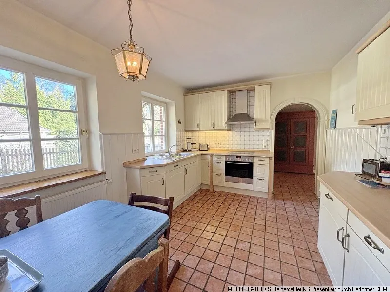 Die geräumige Küche ist mit einer vanillefarbenen Einbauküche mit allen elektrischen Geräten und viel Staufläche ausgestattet.