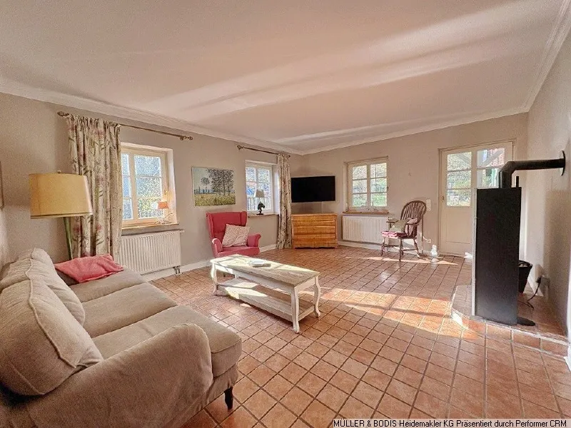 Das große Wohnzimmer wurde erst kürzlich mit einem modernen Pelletofen ausgestattet, der als zusätzlicher Wärmeerzeuger dient. Vor dem Wohnzimmer und dem Hauswirtschaftsraum befindet sich eine Loggia, die einen besonders gemütlichen Sitzplatz am Haus schafft.