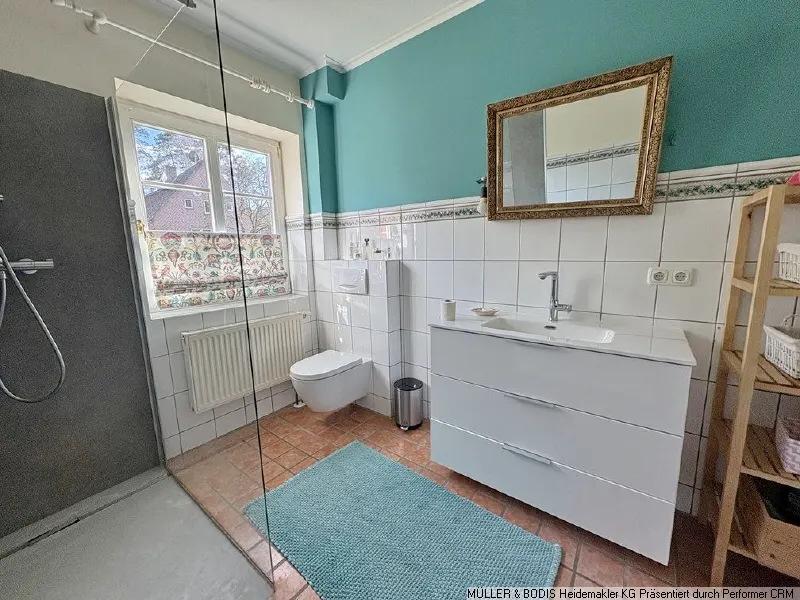 Vom Flur aus erreicht man den Schlaftrakt mit dem frisch renovierten Duschbad. Es verfügt über eine eine ebenerdige Dusche mit Glastrennwand, ein schickes modernes weißes WC und einen weißen Waschtisch.
