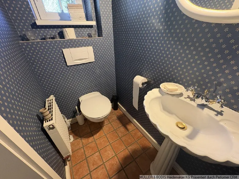 Man betritt das Haus durch die hübsche Haustür und erreicht dann zunächst den Windfang. Zur Linken befindet sich das liebevoll ausgestaltete Gäste-WC mit muschelförmigem Waschbecken und WC.