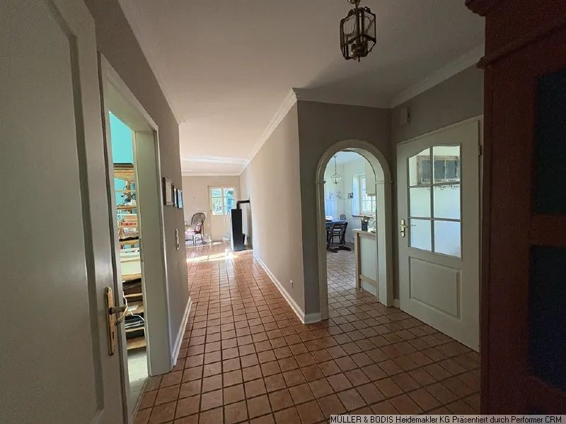 Das gesamte Erdgeschoss mit Ausnahme der drei Zimmer, die mit einem hellgrauen Vinylboden in Holzoptik ausgelegt wurden, ist mit einer terracottafarbenen Bodenfliese verlegt. Bei den Innentüren handelt es sich um weiße Füllungstüren, teils sind hübsche runde Türzargen (ohne Tür) eingebaut.