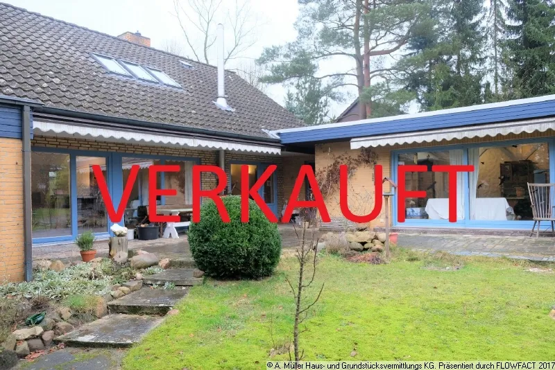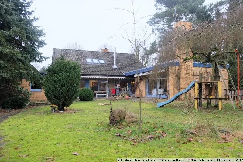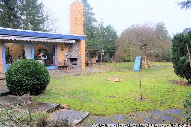 Das 1.172 m2 große Grundstück ist zum Süden hin ausgerichtet und fast uneinsehbar. Durch den L-förmigen Baukörper des Hauses wurde hier ein gemütlicher, windgeschützter, teils überdachter Terrassenbereich geschaffen, der über einen gemütlichen Aussenkamin verfügt.
