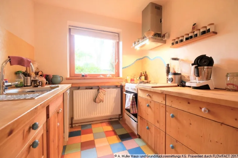 Die Küche ist offen zum Wohnflur und mit naturhölzernen Einbaumöbeln versehen. Der Fussboden ist fröhlich mit bunten Fliesen ausgelegt. Die Küche verfügt über einen Gasherd mit Phrasenabzug, eine Spüle und einen kleinen Geschirrspüler. Ein großer separater Kühlschrank befindet sich im Wohnflur.