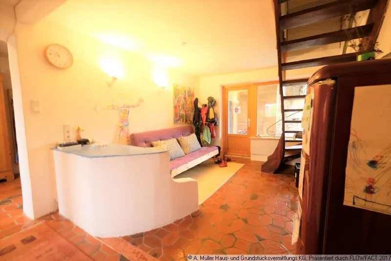 Nach Betreten des Objektes befindet man sich im Hausflur, der zur Rechten in einen gemütlichen Wohnflur übergeht. Praktisch wurde dieser Bereich mit einer rotbraunen Bodenfliese ausgelegt.