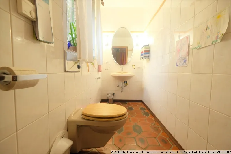 Im Anbau des Hauses finden Sie zunächst zur Linken das schlichte weiß gekachelte Gäste-WC vor. Es schliesst sich dann das geräumige Vollbad an. Hier sind die Wände mit dunkelgrünen Kacheln versehen. Das Vollbad bietet eine Dusche, ein Handwaschbecken und eine Badewanne. Der Waschmaschinenanschluss wurde hier installiert.