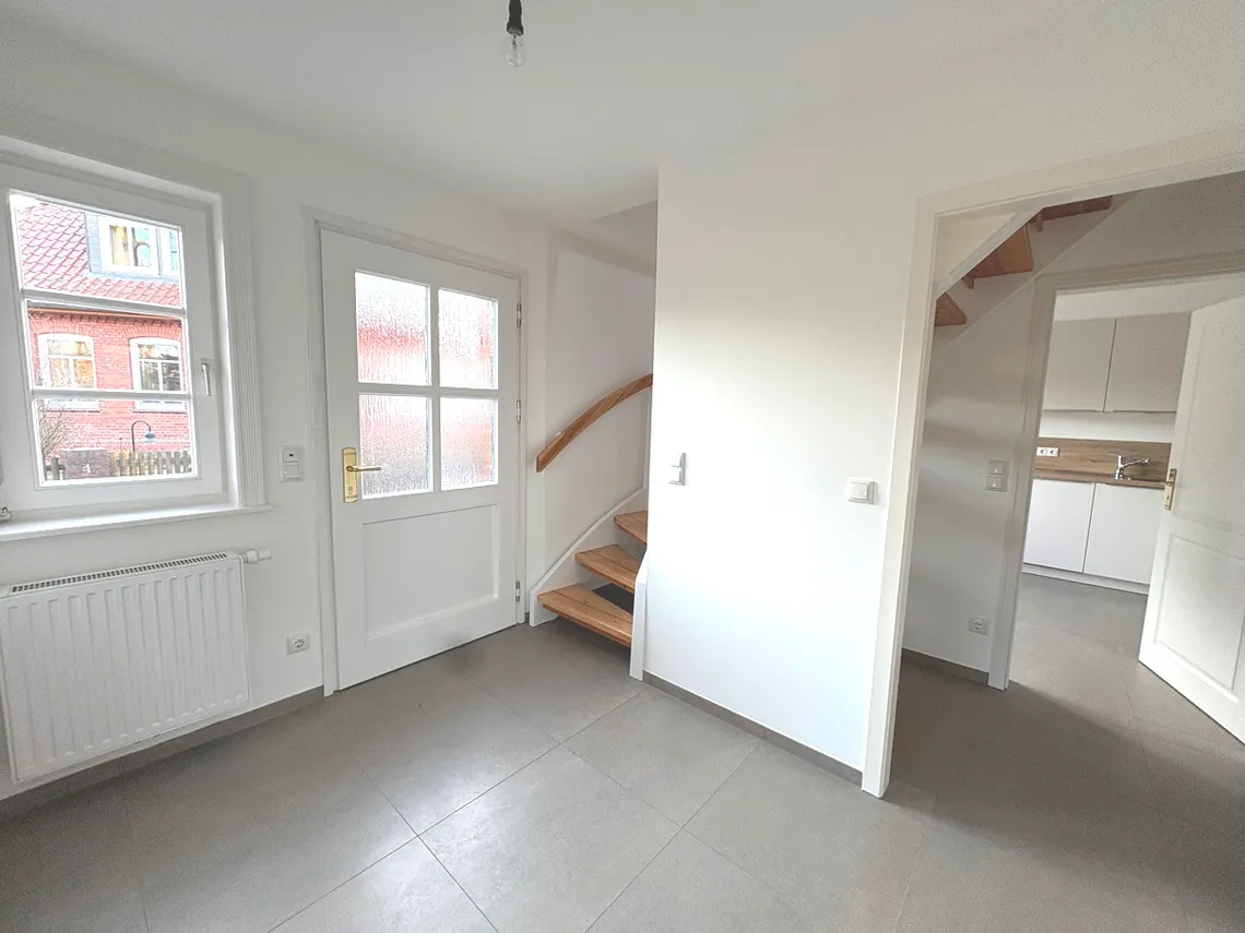 Nach Betreten der Haustür erreichen Sie den geräumigen Hausflur. Zur Rechten befindet sich das große helle Wohnzimmer gen Süden. Das Erdgeschoss wurde mit Ausnahme des Wohnzimmers mit einer schlichten grauen Bodenfliese verlegt. Im Wohnzimmer befindet sich ein hübscher Venylboden in Holzdielenoptik.