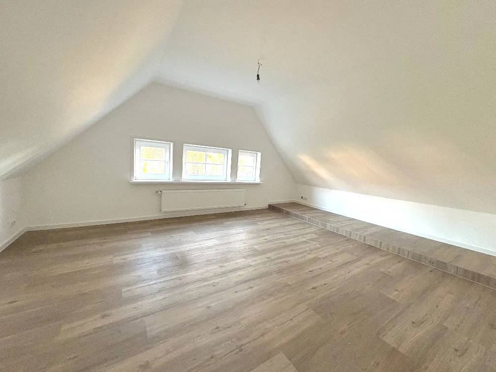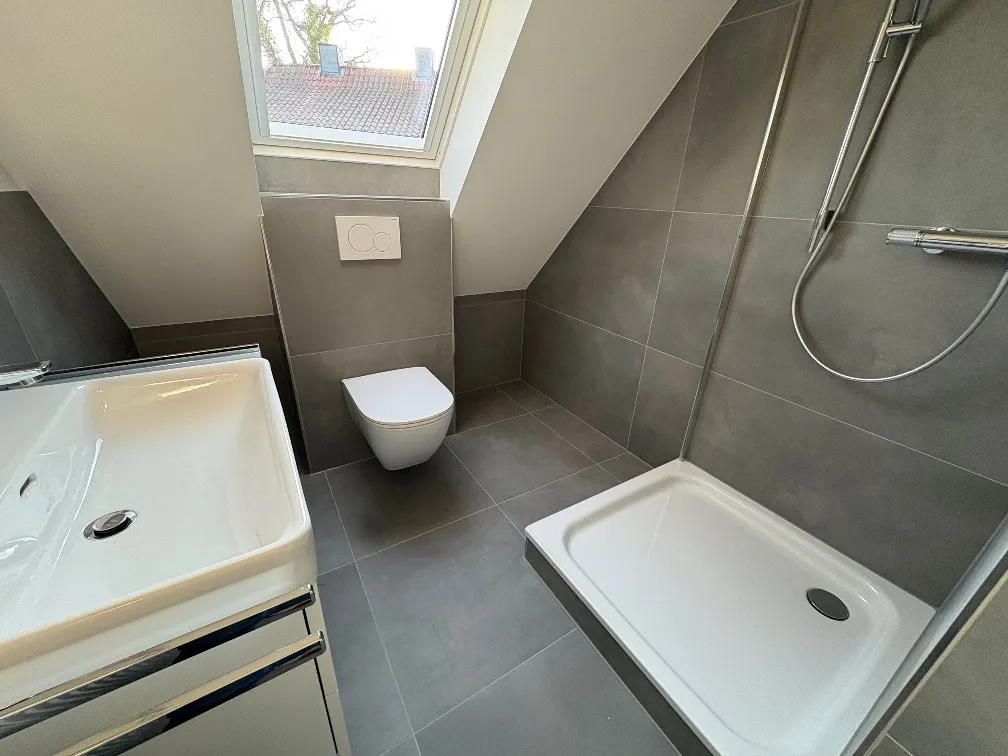 Hier oben wurde im Flur und den beiden Zimmern ebenfalls der Venylboden in Holzdielenoptik verlegt. Das Duschbad verfügt über eine hübschen Waschtisch, eine Dusche mit Glasabtrennung und ein WC. Der Boden und die Wände sind schlicht in grau gekachelt.