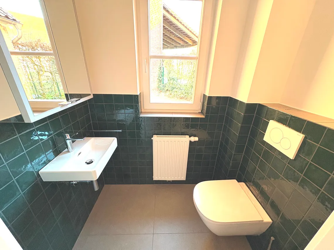 An das Gartenzimmer schliesst sich das hübsche neue Gäste-WC an, das mit einer sehr zeitgemäßen dunkelgrünen Wandfliese und weissen Objekten ausgestattet ist (WC und Handwaschbecken).