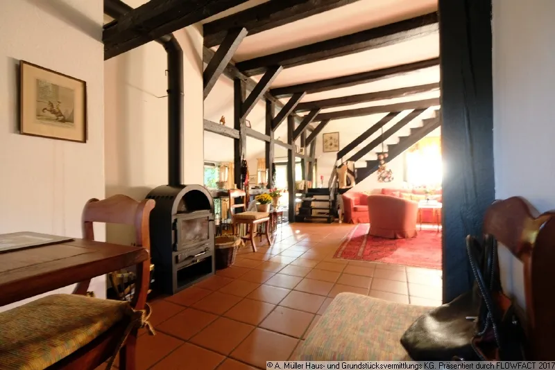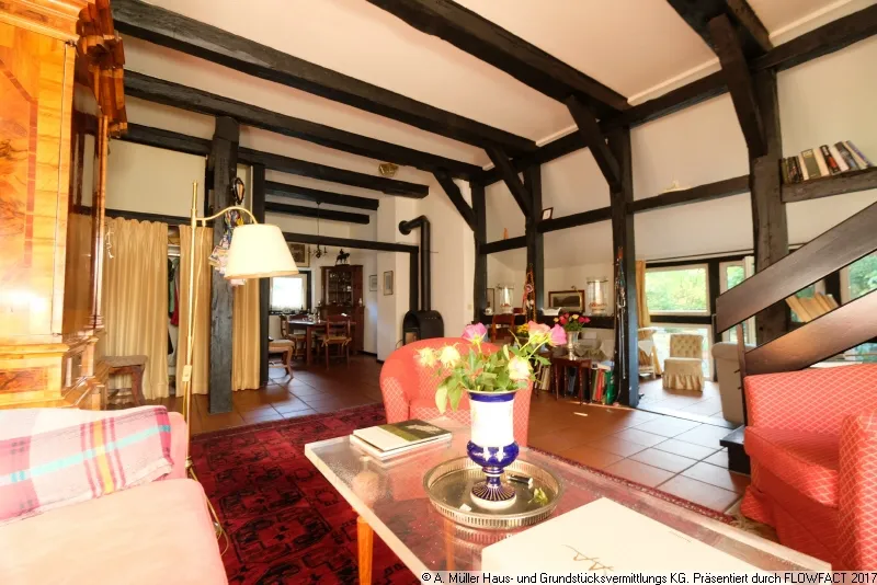 Zum Garten geht der Wohnbereich nur durch eine offene Fachwerkkonstruktion getrennt - in das Kaminzimmer über. Der offene Kamin hier wird nicht mehr benutzt, als Alternative wurde im Wohnbereich ein gemütlicher Kaminofen eingebaut, der in der kälteren Jahreszeit eine wohlige Gemütlichkeit schafft.