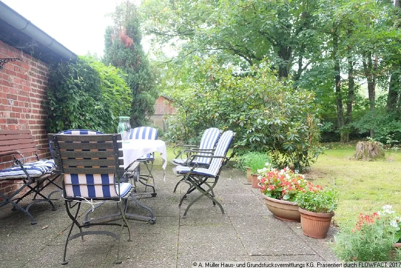 Vom Kaminzimmer mit seinen verglasten Fachwerkelementen zum Garten hin erreicht man die gen Süden ausgerichtete Terrasse. Der Garten ist hier wunderschön fast uneinsichtig eingewachsen, aber dennoch sehr pflegeleicht gestaltet. Immergrüne Gehölze stehen hier unter großen alten Bäumen und rahmen die Rasenfläche ein.
