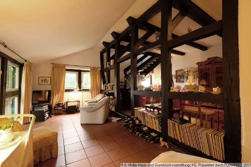 Es handelt sich um ein hübsches hartgedecktes Fachwerkhaus mit sehr gemütlicher Atmosphäre. Besonders der großzügige Wohn-/Essbereich mit dem eindrucksvollen Sichtständerwerk verfügt über viel Charme.