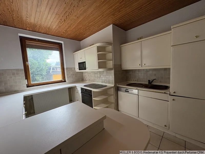 Der Zugang erfolgt über eine Veranda, die in den zentralen Flur des Hauses führt. Linker Hand befindet sich die Küche, ausgestattet mit einer funktionalen Einbauküche, Herd, Spülbecken und einem großen Fenster, das den Raum mit Tageslicht durchflutet. Die Küche bietet viel Arbeitsfläche und Stauraum.