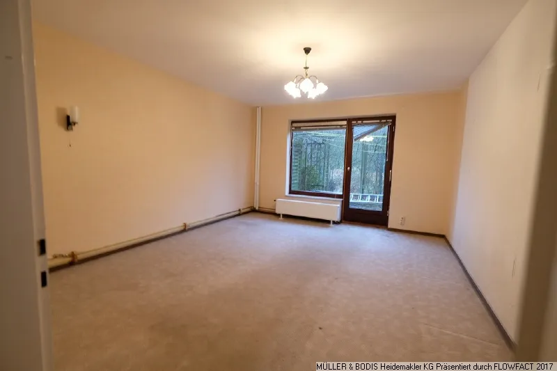 Vom Wohnzimmer aus gelangen Sie auf die Terrasse, die den Blick in das leicht abfallende, nach Westen ausgerichtete Grundstück in die Natur bietet.