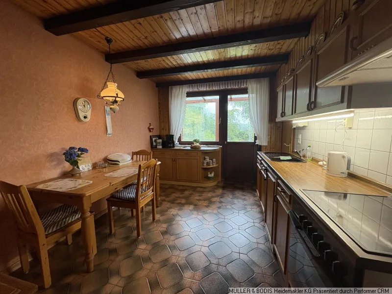 Die Einbauküche ist etwas älter, sehr gepflegt und bietet ausreichend platz für einen gemütlichen Sitzplatz. Sie verfügt über die notwendigen elektrischen Geräte und eine kleine angrenzende praktische Vorratskammer. Es handelt sich hierbei um maßgefertigte Vollholzfronten mit einer Kunststoffarbeitsplatte. Von der Küche aus erreichen man über einen kleinen Vorbau den wunderschönen Garten