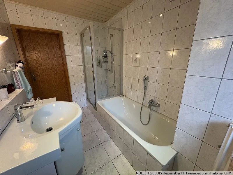 Das Duschbad ist an Wänden und Fussboden hellgrau gefliest und bietet eine Dusche, eine Wanne, ein WC und einen Waschtisch.