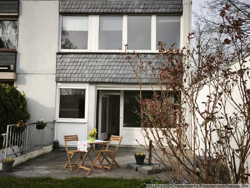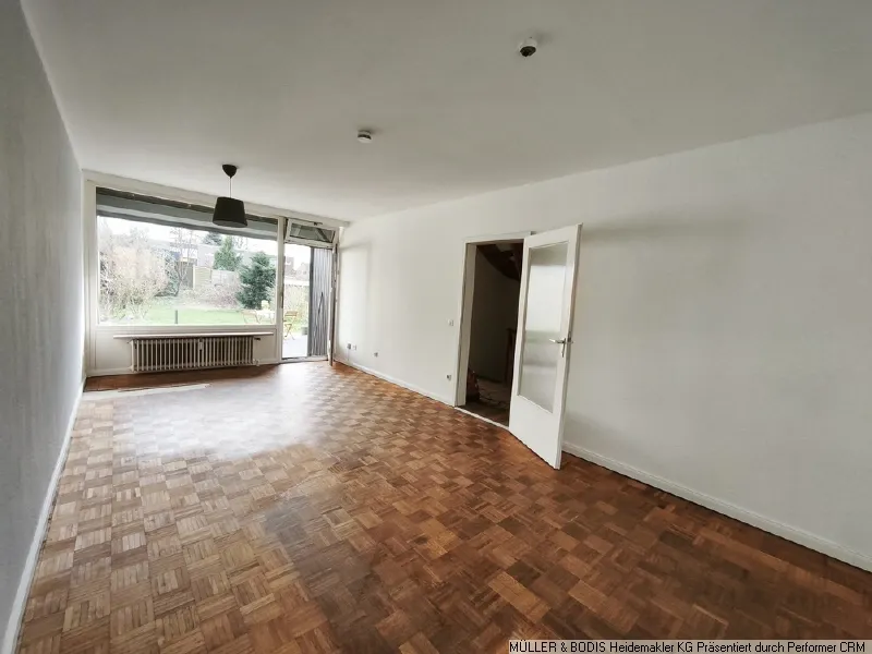 Das große geräumige Wohnzimmer ist mit einem Echtholzparkett (Vollholz) ausgestattet, das im Zuge der Renovierung 2021 abgeschliffen und neu versiegelt (geölt) wurde. Vom Wohnzimmer aus gelangt man auf die ebenfalls in 2021 neu gepflasterte Terrasse und den kuscheligen, von außen uneinsehbaren und nach Süden ausgerichteten Garten.