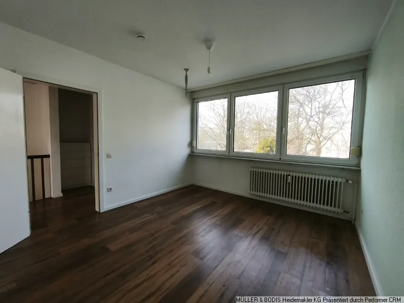 Ins Obergeschoss führt eine hübsche offene Holztreppe. Aufgrund des Flachdachs (in 2015 erneuert) gibt es hier keine Dachschrägen. Hier finden Sie zwei lichtdurchflutete Zimmer mit jeweils 14 m² sowie ein weiteres kleineres Zimmer mit 7,5 m², das gut als Büro oder Gästezimmer genutzt werden kann.