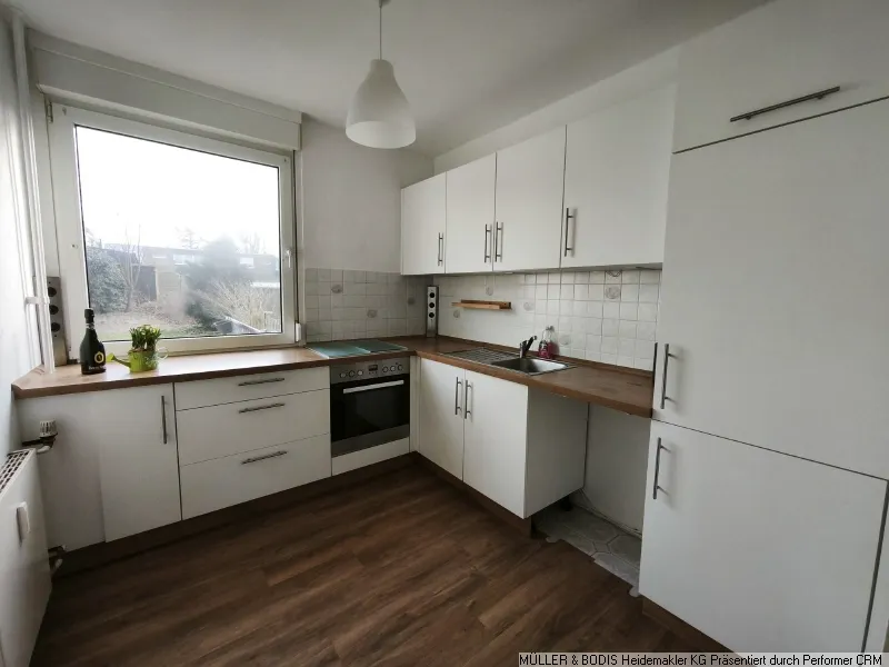 Die moderne Einbauküche mit Arbeitsplatte in Holzoptik wurde in 2021 neu installiert und bietet neben ausreichend Stauraum eine Edelstahlspüle, einen Backofen und ein Ceran-Kochfeld. Die Fronten der Ober- und Unterschränke sind cremeweiß mit modernen Griffen gestaltet. Eine Geschirrspülmaschine kann nachgerüstet werden, Platz dafür ist vorhanden.