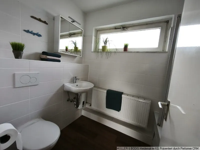 Nach Betreten des Hauses erreicht man den Hausflur. Vorn rechts befindet sich das helle, befensterte Gäste-WC. Der Eingangsbereich ist mit Fliesen, der weitere Flur mit einem Laminatfussboden in Holzoptik durchgehend bis in die Küche verlegt.