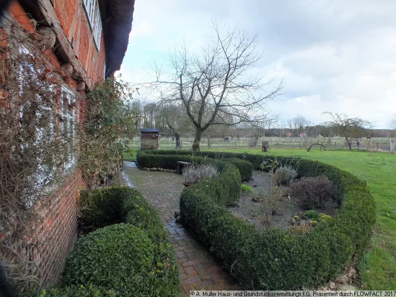 Große alte Eichen, ein Bauerngarten umsäumt von Buchsbaumhecken, Kletterrosen an der Fachwerkfassade, Pferde auf den angrenzenden Weideflächen, eine Fernsicht über die eigenen Weiden gen Süden - ein Traum von einem Hof!