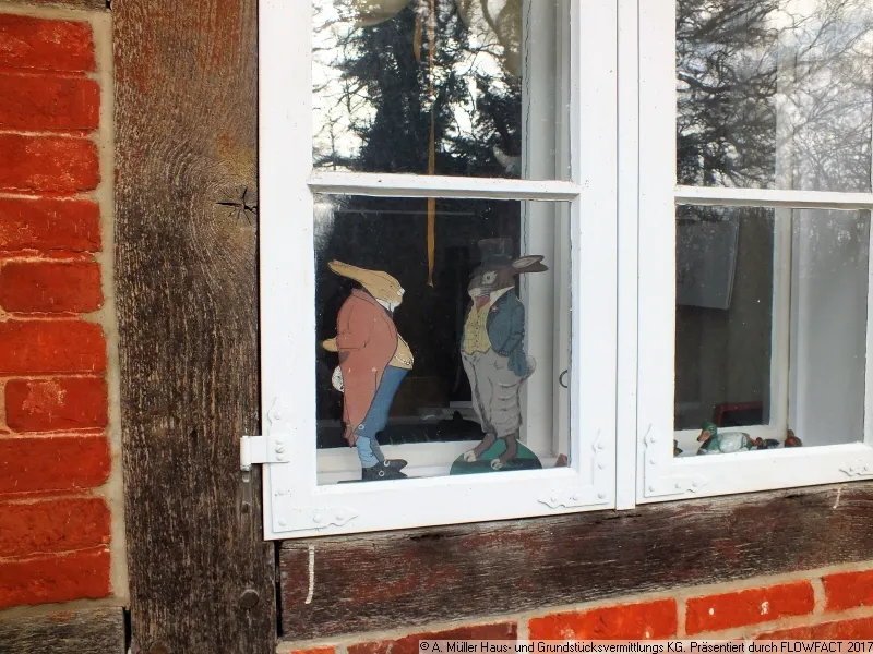 Besonders eindrucksvoill ist hier der große Wohnflur mit dem Kamin in der Mitte. Die Fußböden sind teils mit Dielen, teils mit Ziegelpflaster verlegt. Die Fenster wurden als Holzkastenfenster erstellt.