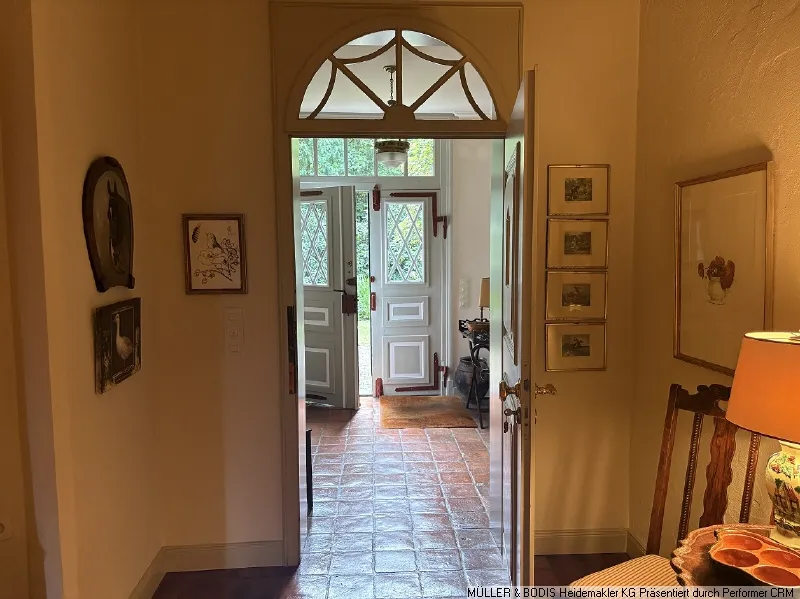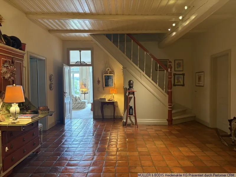 Nach Betreten des Haupthauses durch die bildhübsche historische Haustür gelangt man zunächst in einen kleinen Windfang, der sich dann in die große Wohnhalle - dem Zentrum des Haupthauses - öffnet.