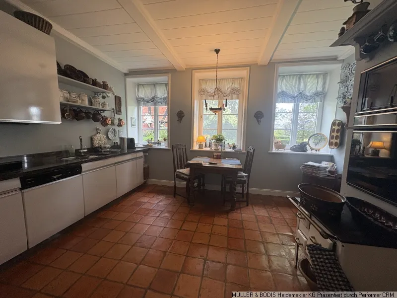 Im Laufe der Zeit wurde eine Einliegerwohnung im Stalltrakt ausgebaut, die über ein Wohn-/Schlafzimmer, eine Küche, ein Badezimmer und einen eigenen Hausflur mit Eingang von Norden verfügt. Dieser Bereich ist ideal vielleicht für ein Au-Pair oder einen alleinstehenden Elternteil zu nutzen und kann auch trockenen Fusses von der Hauptwohnung erreicht werden.