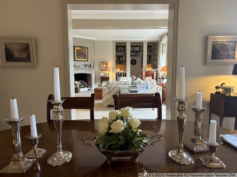Besonders beeindruckend ist der großzügige Wohn-/Essbereich mit kleiner Bibliothek mit einer Raumhöhe von 2,75 m, dem die große Terrasse mit dem Blick durch den Garten auf die angrenzenden Wiesen ins Auetal vorgelagert ist.