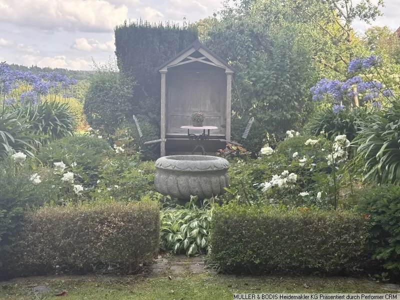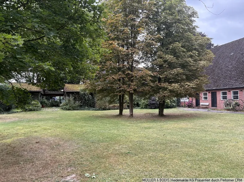 Über eine private Zuwegung, die eine Uneinsichtigkeit des Grundstückes schafft, erreicht man die ca. 5.000 m2 große Hoffläche. Sie ist arrondiert von schönen alten Bäumen. Der Garten ist pflegeleicht mit großen Rasenflächen angelegt, die mit einer Hecke zu den dazugehörenden Wiesen hin abgegrenzt sind. Zu den Grundstücksgrenzen hin sind Gehölze und teils auch Beete angelegt.