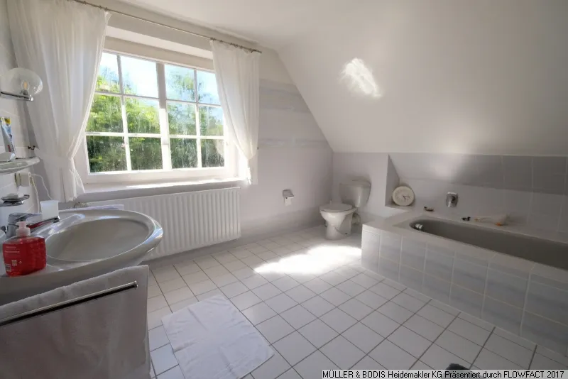 Das große Badezimmer ist in lichtgrau an den Wänden sowie am Fußboden gefliest und verfügt über Objekte Ton in Ton. Hier finden Sie ein Handwaschbecken, eine Badewanne, ein WC und eine separate Dusche vor.