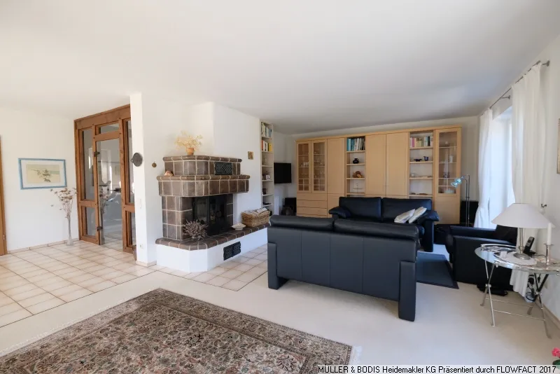 Im Wohnzimmer, das mit seinen bodentiefen Sprossenfensterelementen besonders viel Lichteinfall erhält, wurde ein gemütlicher, offener Kamin mit einer Glasscheibe installiert, welcher vom Schornsteinfeger bei zeitweiser Nutzung auch ohne Feinstaubfilter aktuell genehmigt ist. Der Essbereich befindet sich in einem gemütlichen Erker.