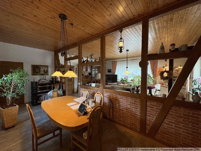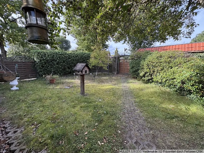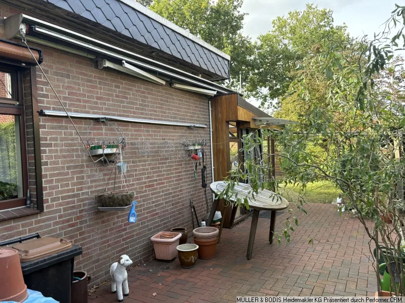 Vom Wohnzimmer aus gelangt man direkt in den lauschigen Garten, der uneinsichtig ist. Es ist mit einer halboffenen Fachwerkwand zum Essbereich hin abgetrennt und mit einer hellgrauen Vinylware ausgestattet. Die 2,80 m hohe Decke ist vertäfelt. Die Haupt-Terrasse ist gepflastert und teils überdacht.
