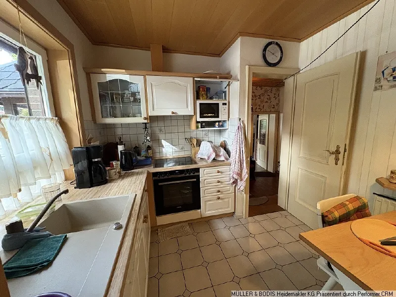 Die Einbauküche ist in weiß mit Landhausfronten ausgestattet, mit einer modernen beigen Spüle und mit einer Arbeitsplatte in Holzoptik versehen. Hier finden sie - teils recht neue - elektrische Geräte, wie einen Geschirrspüler, Herdkochplatten mit Induktion, einen Backofen, eine Kühl-/Gefrierkombination und eine Mikrowelle vor.