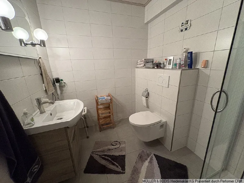 Das zweite Zimmer wird aktuell als Gäste- oder Arbeitszimmer benutzt und ist mit einem Korkfußboden verlegt. Es schließt sich das weiße, erst kürzlich renovierte Duschbad mit ebenerdiger Dusche, Handwaschbecken und WC an.