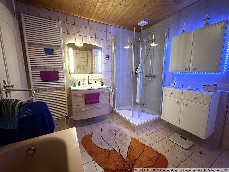 Durch das große Vollbad erreicht man das Schlafzimmer. Das Bad ist in weiß gekachelt und bietet eine Dusche, eine Badewanne, ein WC, einen Waschtisch und einen Handtuchheizkörper. Im geräumigen sich anschließenden Schlafzimmer wurde ein Einbauschrank installiert. Im Schlafzimmer ist der Fußboden in Eichen-Parket ausgelegt.