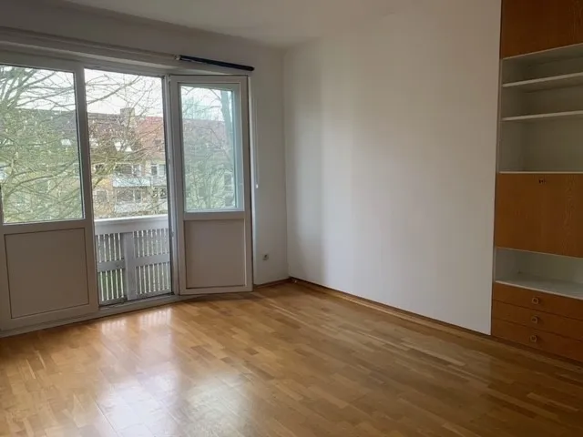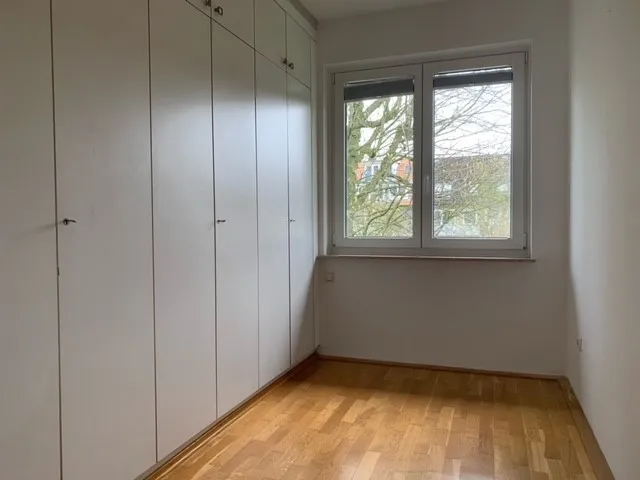 Angrenzend an den Wohnbereich befindet sich das Schlafzimmer. Die Wohnräume sind mit Echtholzpakett verlegt und wirken aufgrund der großen Fenster und der Terrassentür mit französischem Balkon sehr hell und freundlich.
