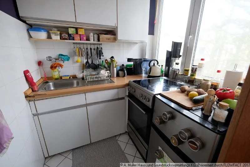 Über das gepflegte Treppenhaus gelangen Sie in den Eingangsbereich der Wohnung. Das Herzstück der Wohnung ist der Wohnbereich mit ca. 14,5 m² Wohnfläche. Von hieraus ist links die kleine Küche zu erreichen, die mit weißen Einbaumöbeln ausgestattet ist. Der Elektroherd mit Ceranfeld sowie der Kühlschrank sind Eigentum des derzeitigen Mieters.