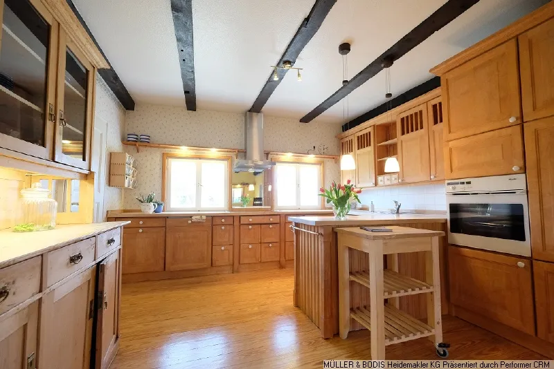 Daran schließt sich die große, gemütliche Wohnküche, der zentraler Ort des Hauses, an. Sie ist mit einer geräumigen Einbauküche aus massivem, geölten Erlenholz ausgestattet, die viel Stauraum und alle elektrischen Geräte beinhaltet. Ein großer, langer Esstisch findet hier viel Platz zur Kommunikation. In einem gemütlichen, nur durch offenes Fachwerk optisch getrennten Nebenraum von ca. 9 qm, steht ein Kaminofen, vor dem 2 Sessel mit Blick auf das Feuer stehen können.