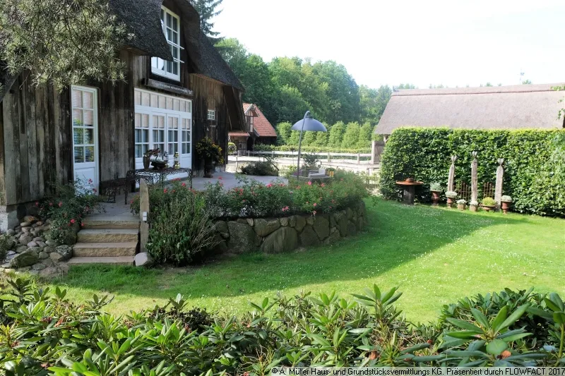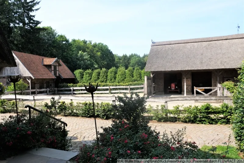 Das wunderschöne reetgedeckte, im Stil eines denkmalgeschützen niedersächsischen Schafstalles erbaute Wohnhaus wird arrondiert von mehreren Fachwerkgebäuden, die in Eichenfachwerk erstellt wurden. So finden Sie hier einen Pferdestall, einen "Eselstall", ein Hühnerhaus, einen Freisitz, ein Backhaus und einen Holz- und Abstellschuppen vor.