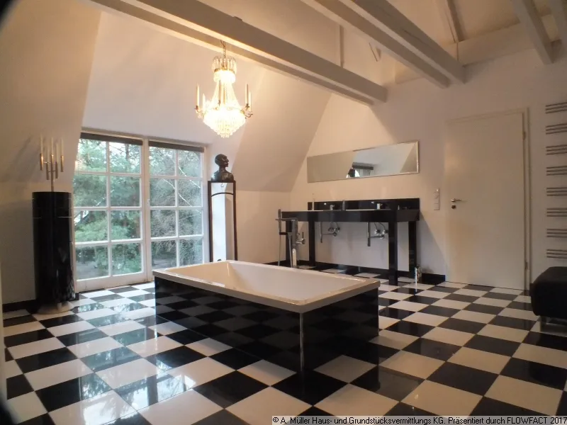 Das großzügige Vollbad ist mit hochwertigem Granit ausgestattet und farblich in schwarz-weiß gehalten. Es verfügt mittig im Raum über eine Badewanne, eine außergewöhnlich muschelförmig angelegte Dusche mit Mosaik-Natursteinen, einen Doppelwaschtisch und ein WC.