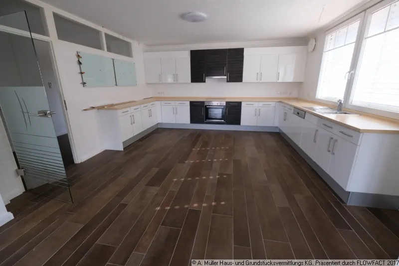 Im Obergeschoss erwartet Sie ein offener Wohnung- und Essbereich mit der angrenzenden Küche. Die Küche ist mit einer modernen Einbauküche versehen und bietet jede Menge Platz und Staumöglichkeiten. Sie verfügt über eine Arbeitsplatte in Holz-Optik und alle notwendigen Geräten.
