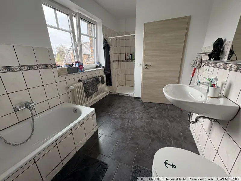 Die Bäder im Erd- und im Obergeschoss verfügen jeweils über eine Badewanne, eine separate Dusche, ein WC und ein Handwaschbecken. Sie sind modern in hellen Tönen an den Wänden gekachelt, die mit einem hübschen Fries unterbrochen sind. Die Badobjekte sind schlicht weiß, die Bodenfliesen in anthrazit gehalten.