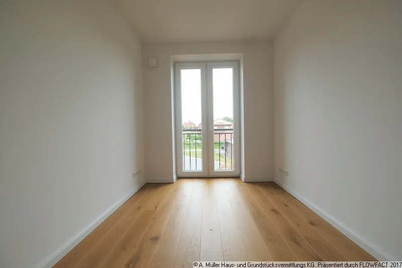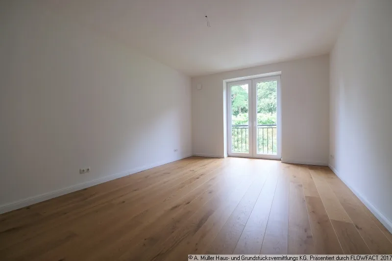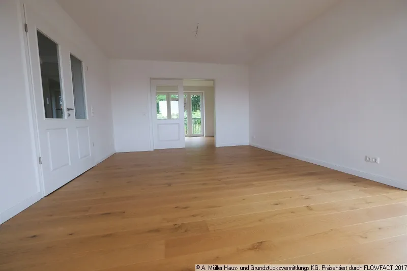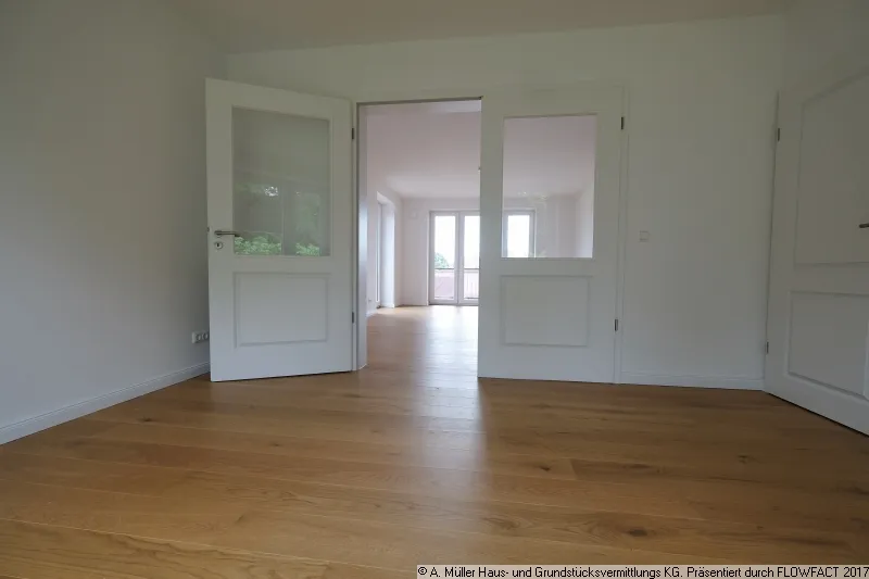 Die Ihnen hier angebotene großzügige Wohnung liegt rechts im Obergeschoss und verfügt über 3,5 Zimmer, wobei das Wohnzimmer großzügig ins Ess- oder Arbeitszimmer übergeht. Durch die Belichtung von drei Seiten durch die bodentiefen Fenster besticht diese Wohnung durch ihre besonders großzügige und lichte Atmosphäre. Die bodentiefen Fenster sind mit französischen Balkonen versehen.