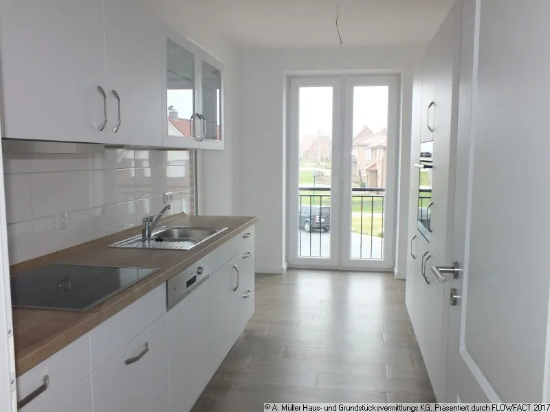 Die Küche ist mit einer schicken weißen Einbauküche mit holzfarbener Arbeitsplatte ausgestattet, in der alle elektrischen Geräte beinhaltet sind. Hier in der Küche ist genügend Platz für einen gemütlichen Essplatz. Von der Küche aber auch vom Wohnbereich ist die knapp 10 m² große Loggia zu betreten.
