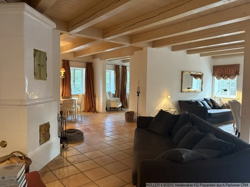 Im Erdgeschoss wurde das sichtbare, tragende Balkenwerk hell lasiert, was eine besondere Atmosphäre schafft. Im offenen Wohn-Essbereich mit angrenzender Bibliothek wurden zwei wunderschöne weiße Kachelöfen installiert, die eine besondere Gemütlichkeit schaffen.